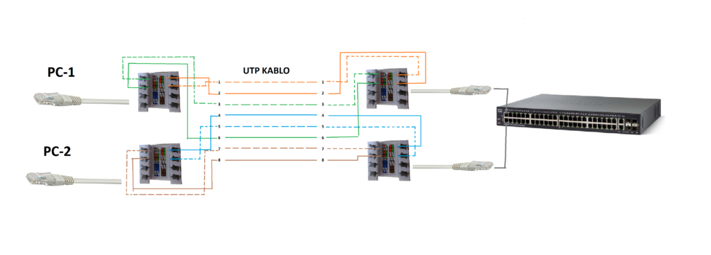 Şimdi basit bir senaryo düşünelim; kablo çekilmesi zor olan bir yerdesiniz ve olduğunuz yerde 2 bilgisayar çalışacağını ve ortamda yalnızca 1 kablo olduğunu düşünelim. Bu durumda en azından acil olarak işi çözmek için 1 utp ile 2 ağ bağlantısı yapılması konusunda aşağıdaki şemayı hazırladım.